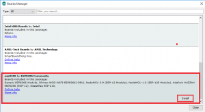 - go to tools -> board manager and search for ESP8266 and install the libraries/files