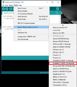 selext NodeMCU board by going: Tools -> Boards(scroll down the list of boards) -> NodeMcu 1.0(ESP-12E Module)