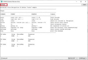 5.  Send command settings(case insensitive) to check Voice Recognition Module settings. Input settings, and hit Enter to send.
